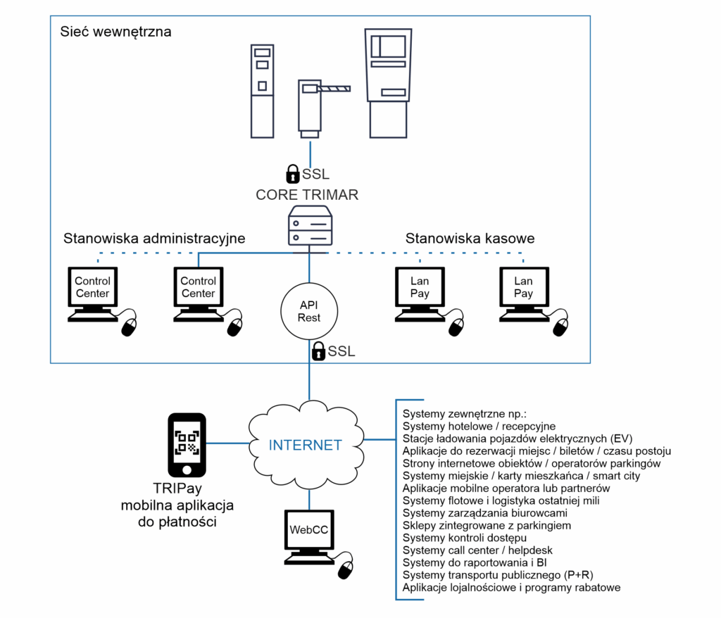 API Rest systemu TRIMAR to zaawansowany i wszechstronny interfejs, umożliwiający pełną zdalną integrację z funkcjonalnościami systemów parkingowych TRIMAR (Control Center, LAN PAY, urządzenia). API obsługuje zarówno tryb HTTP(S), jak i WebSocket (ws://), oferując szerokie możliwości kontroli, monitorowania i integracji z systemami zewnętrznymi.
